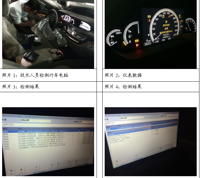 針對上述疑點,我司調(diào)查人員通過外聯(lián)手段,聯(lián)系了與我司合作的車輛技術服務機構,希望能從氣囊爆炸時間入手,核實事故真實時間。調(diào)查人員帶領技術部奔馳組的專家,攜帶奔馳車專用電腦一同前往常州金壇德奧汽修。在對汽車進行一系列的技術診斷之后,電腦已能顯示出具體出險日期系2014年6月14日,但由于車輛受損嚴重,電瓶曾一度斷電,造成數(shù)據(jù)丟失。故具體出險時間未能讀取。